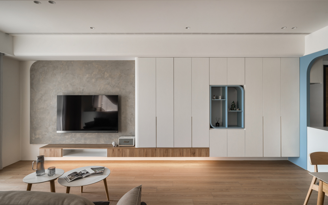 溫暖的午後氛圍有藍天與和煦的陽光相伴木質的溫潤質感與藍調交織出一種清新而平靜的氛圍優柔的曲線增添了一絲優雅,同時又展現出穩重的氣息讓整體空間更添層次與和諧之美